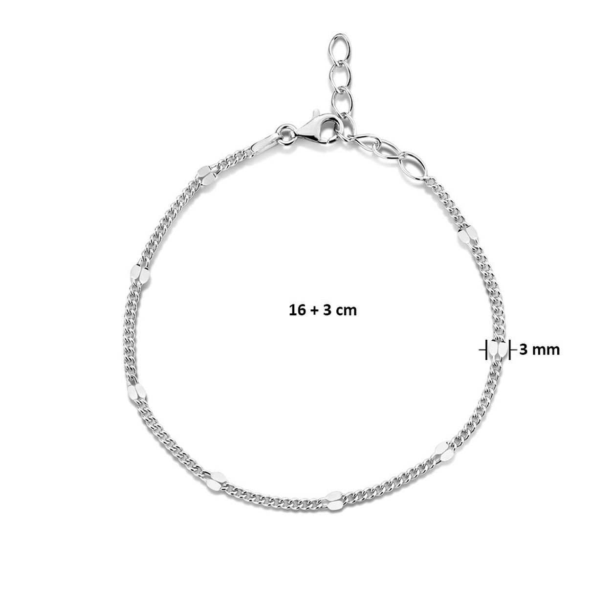 Gerhodineerd 925 zilveren armband met een schakelbreedte van 3mm. De armband heeft een draaglengte van 16cm met een extensie van 3cm en een stevige karabijn sluiting.