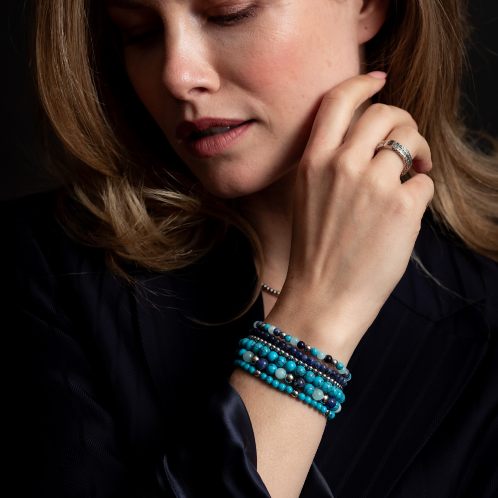 Armband van het merk Rebel & Rose. De armband heeft een hoogwaardige elastische stretch koord, met 6mm van Sodaliet, Art. Turquoise, Jade.