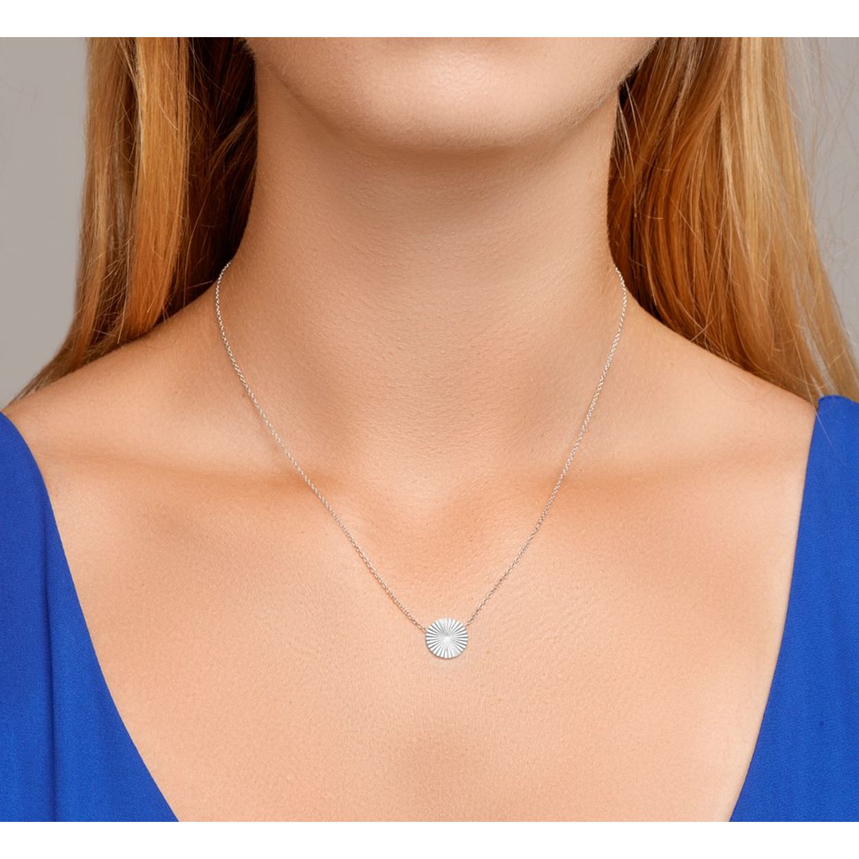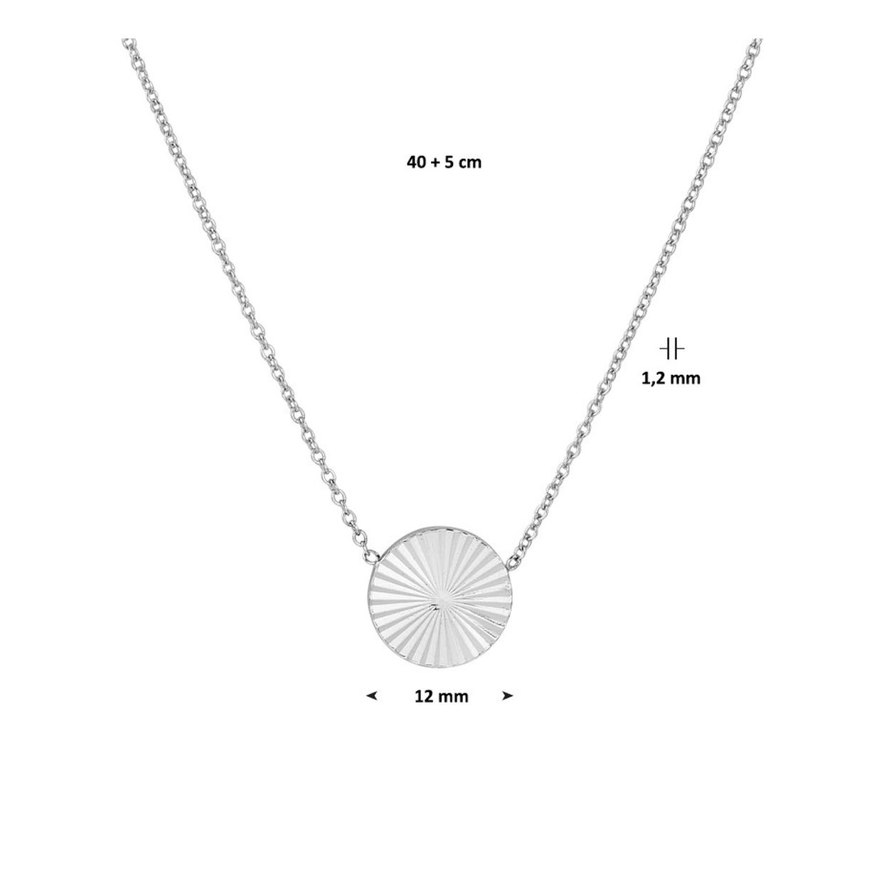 Gerhodineerd 925 zilveren anker collier uitgevoerd met een gediamanteerd rondje van 12mm. Het collier heeft een karabijn sluiting en een draaglengte van 40cm met een extensie van 5cm. De schakelbreedte is 1.2mm.