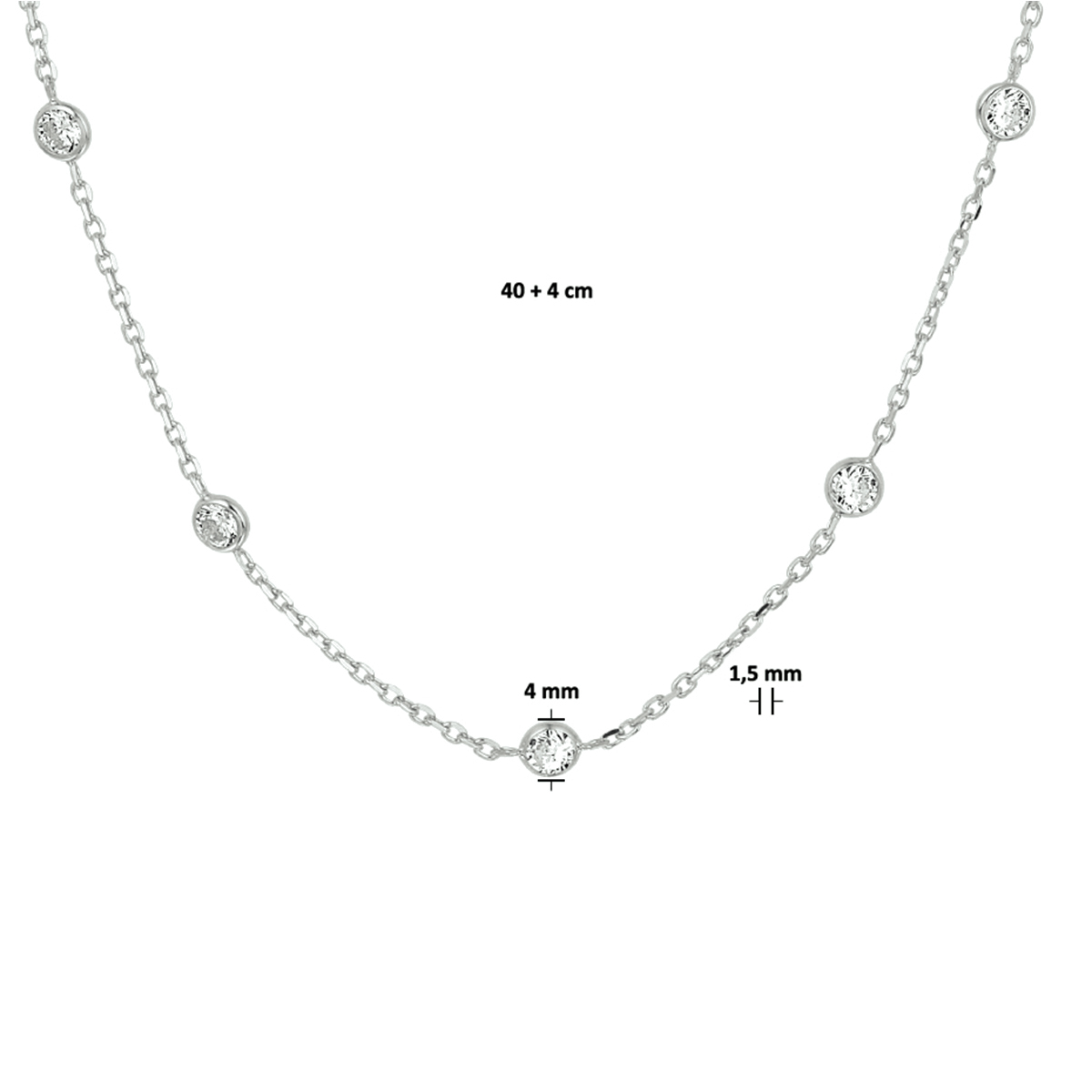 Gerhodineerd 925 zilveren anker collier uitgevoerd met een heldere zirkonia en een karabijn sluiting. Het collier heeft een draaglengte van 40cm met een extensie van 4cm. De schakelbreedte is 1.5mm.