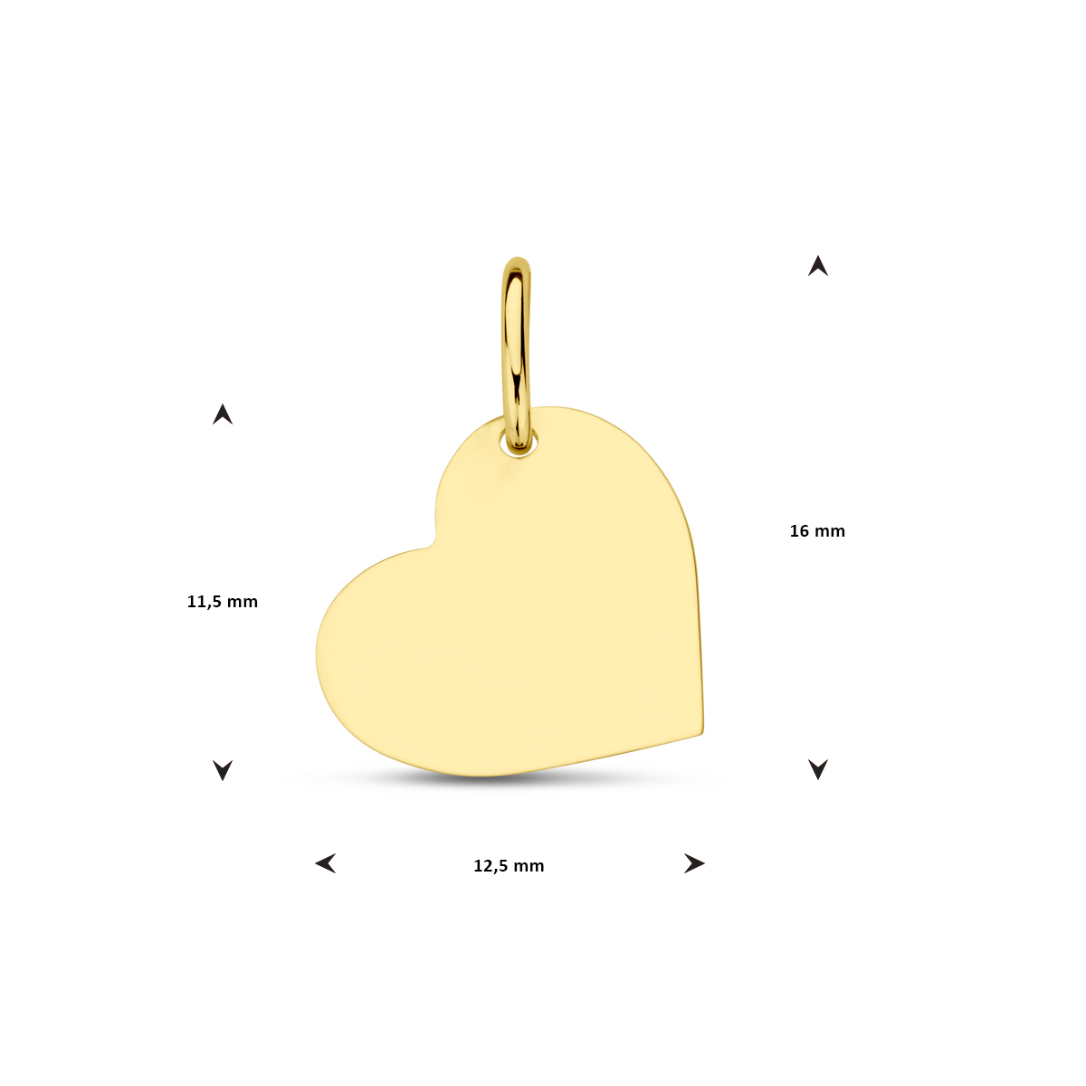 14k Geelgouden hanger met hart. De hanger heeft een totale hoogte van 16mm. Het hart heeft een afmeting van 11.5x12.5mm. De dikte van de plaat is 0.4mm.