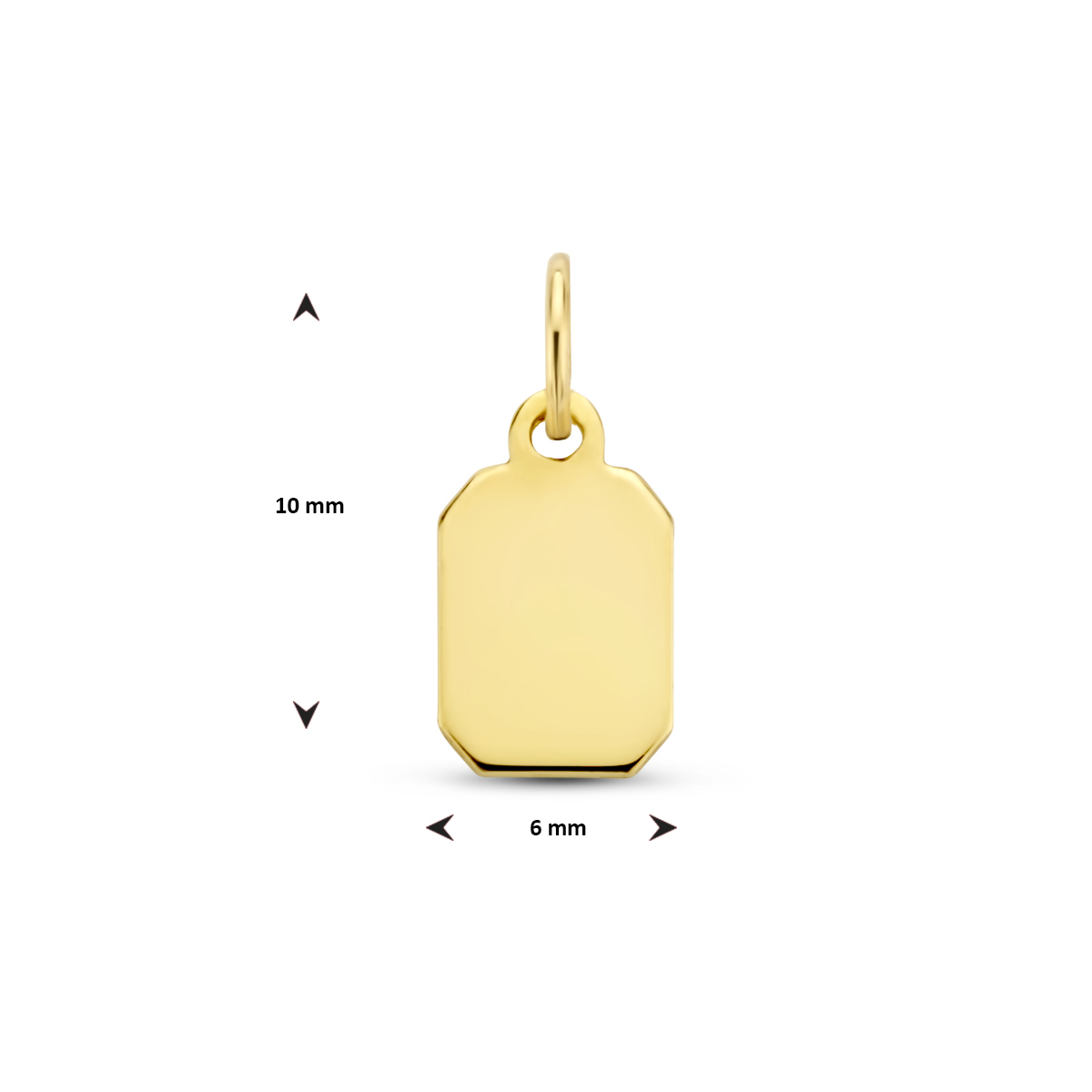 Geelgouden graveerhanger met een afmeting van 10x6mm en een dikte van 0.6mm. Uitgevoerd met een stevig hangoog.
