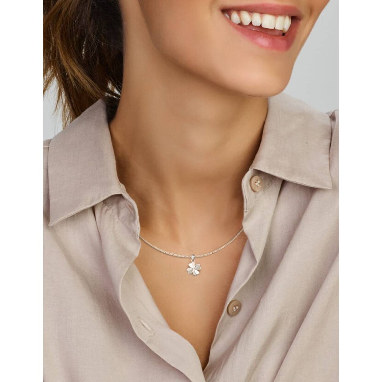 Gerhodineerd 925 zilveren hanger uitgevoerd in de vorm van een klavertje. De hanger heeft een totale hoogte van 1.8cm en een breedte van 12.2mm.