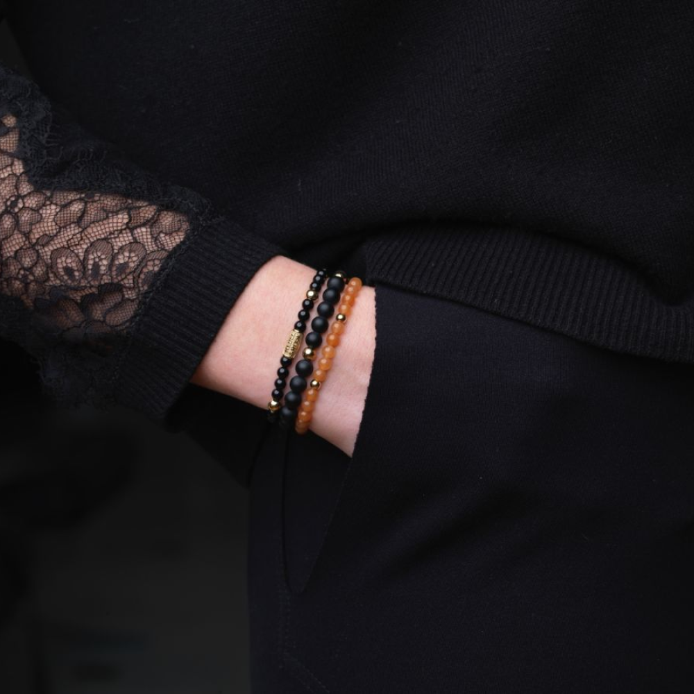 Natuurstenen armband van het merk Rebel & Rose. De armband heeft een hoogwaardige elastische stretch koord, en 6mm mat zwart Agaat natuurstenen en gold plated beads
