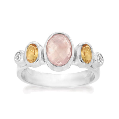 Deze sterling zilveren ring heeft in het midden een 8 x 6 mm rozenkwarts en aan beide kanten een 5 x 3 mm citrien en een 2,5 mm zirkonia.