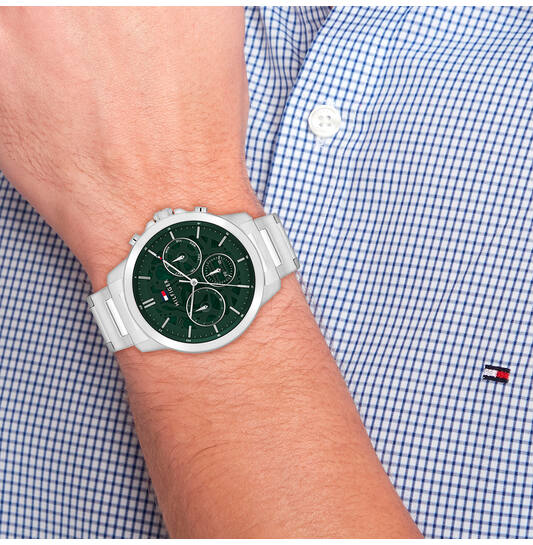 Dit specifieke horloge van Tommy Hilfiger uit de Henry serie met artikelnr: TH1710686 is een stoer herenhorloge die niet in je collectie mag ontbreken. Het herenhorloge heeft een ronde stalen kast met een groene opengewerkte wijzerplaat met een dag, datum en 24-uursaanduiding. Aan de kast zit een stalen schakelband met een vouwsluiting. Het horloge heeft een mineraalglas, een afmeting van 43mm en is 5ATM.