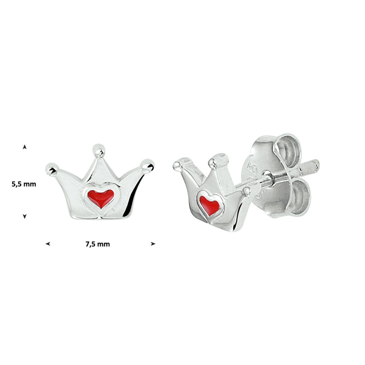 Schattige gerhodineerd zilveren oorknoppen in de vorm van een kroontje met een afmeting van 5.5x7.5mm. Uitgevoerd met een hartje in rode emaille en een stevige poussette sluiting. Deze oorknoppen zijn perfect te combineren met bijpassende sieraden uit onze collectie. Tip: Leuk om kado te geven! Info: Gerhodineerd zilver is door de rhodiumlaag beter bestand tegen verkleuren en krassen.